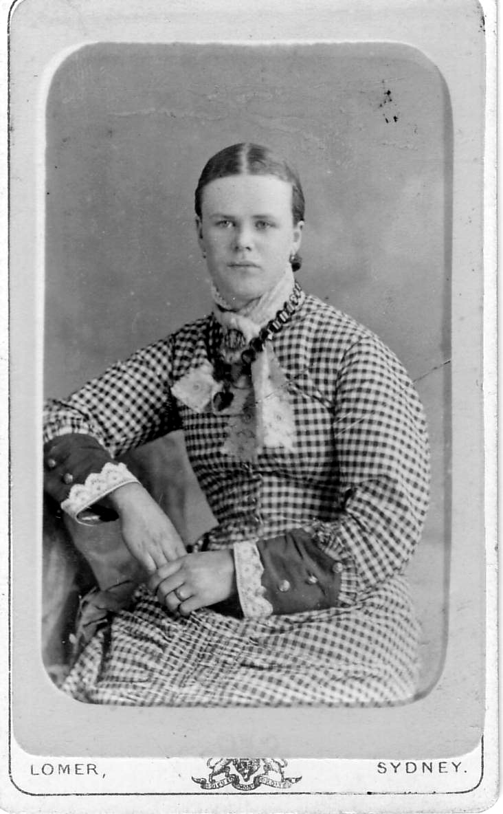 Following her marriage to David on 15 January at the Wesleyan Parsonage in The Rocks, Mary Ann posed for her portrait at photographic studios of Albert Lomer near the Central Railway. She wore her best gingham dress trimmed around the neck and sleeves with lace and proudly displayed her shiny new wedding ring.Mary